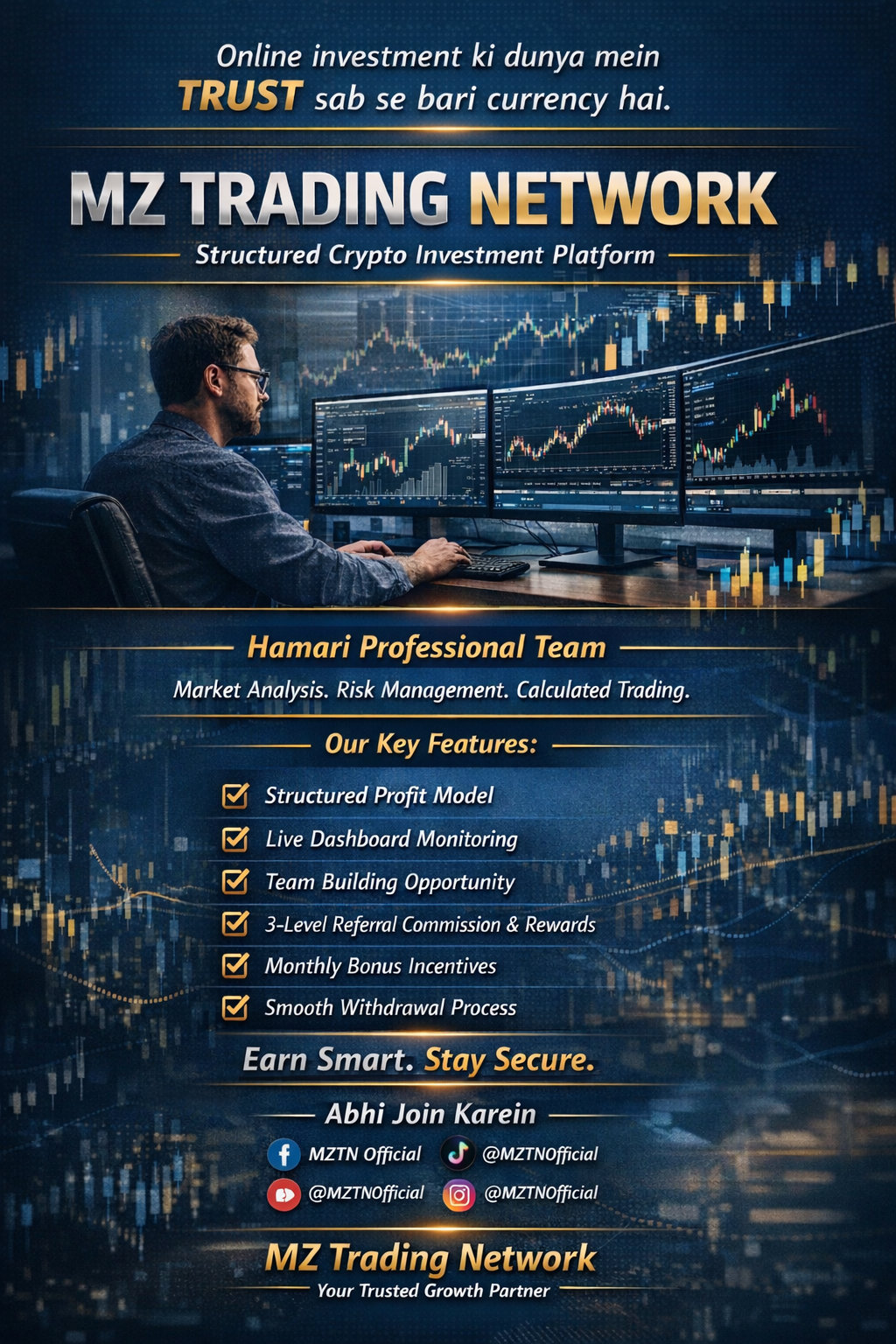 MZ Trading Network is a secure platform where users can invest in plans to earn daily returns and referral bonuses, backed by professional expertise and advanced technology.